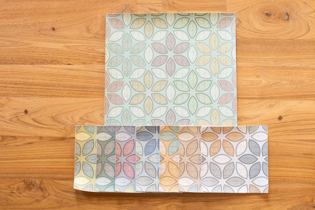 Kristen drew on this proverb in her patterns, inspired by the different forms or meanings this invisible thread could take. When it came to bringing these ideas to life, Kristen began exploring various elements of embroidery and considering how she could replicate the look of embroidered cloth via a pattern on a more durable surface, specifically in healthcare and senior living facilities.