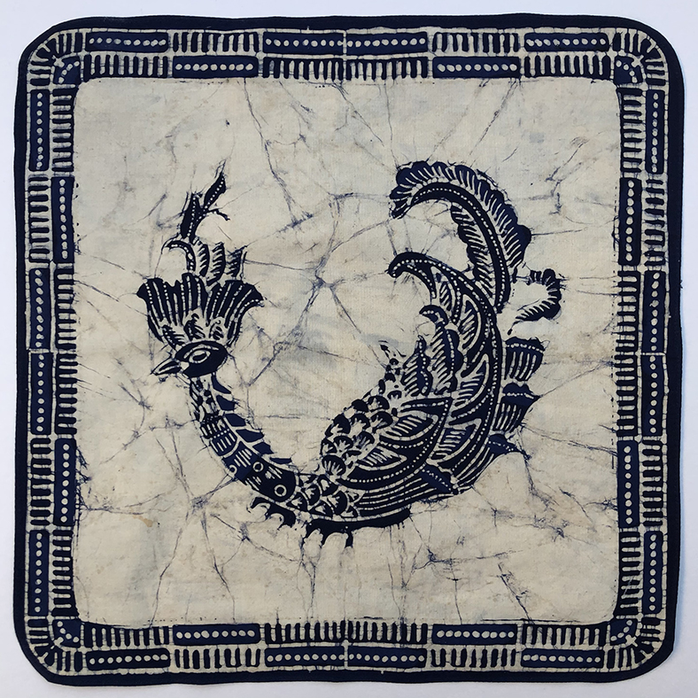 In The Dyer’s Art, Jack Lenor Larsen describes batik as showing “certain similarities to stencil work. The principal difference between them is that stencils are too rigid to fasten onto fabrics for immersion dyeing, while batiks, by definition, involve the application of fluid or semi-fluid substances which solidify on the cloth itself so as to render it impervious to the dyebath. Hot wax, resin, and paraffin, as well as starch, rice paste, bean paste, and even half-fluid mud are used as resist materials.”
