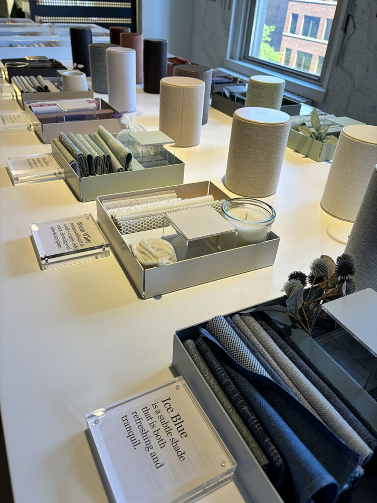 In the Steelcase showroom, they set up an area near their healthcare products devoted to explaining some of their color selections. A sign greeting you said, “Color is powerful. It evokes strong emotions, feelings and memories. It can calm, excite and inspire – influencing our mood and affecting our emotional and physical well-being.” In addition, they displayed boxes, each setting a mood with fabrics and objects and explaining the color. For example, “Ice Blue is a bustle shade that is both refreshing and tranquil.”