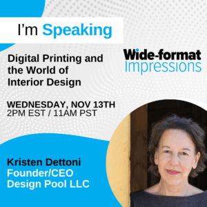 Kristen Dettoni joins Wide-format Impressions for a free educational webinar on November 13 at 2 p.m. EST. Her presentation, Digital Printing and the World of Interior Design, will focus on how printers can effectively approach and serve the interior designer market. This is a free webinar, but people must register in advance.
