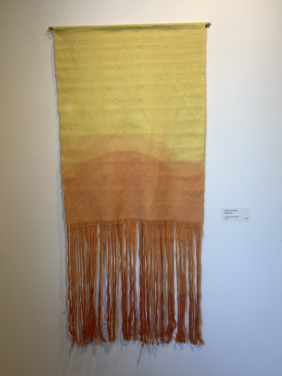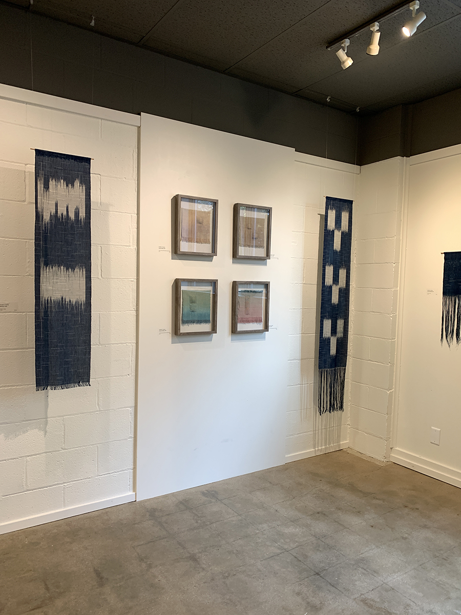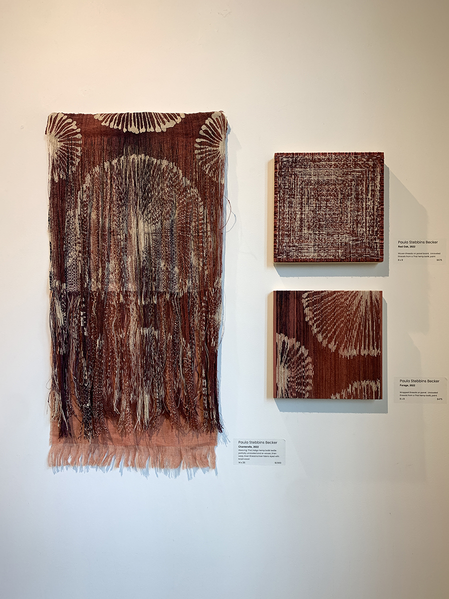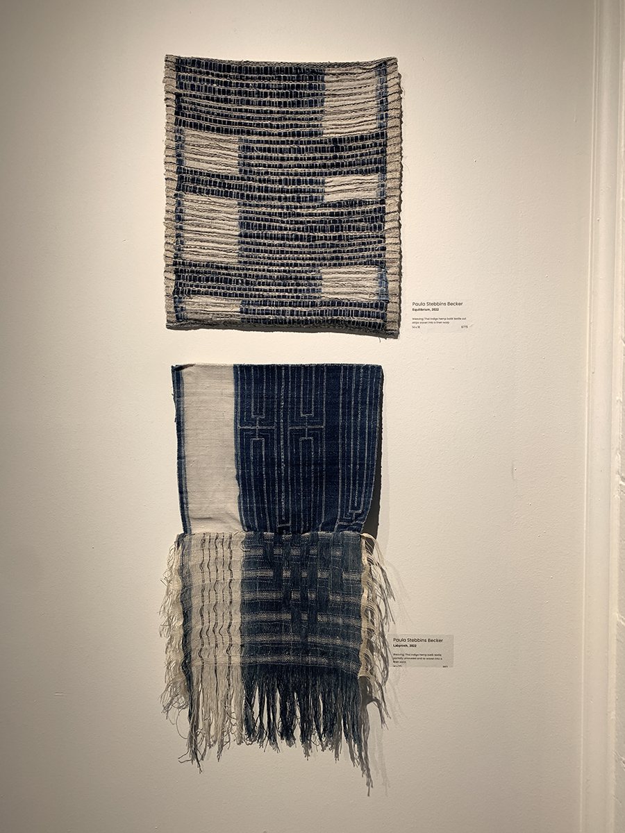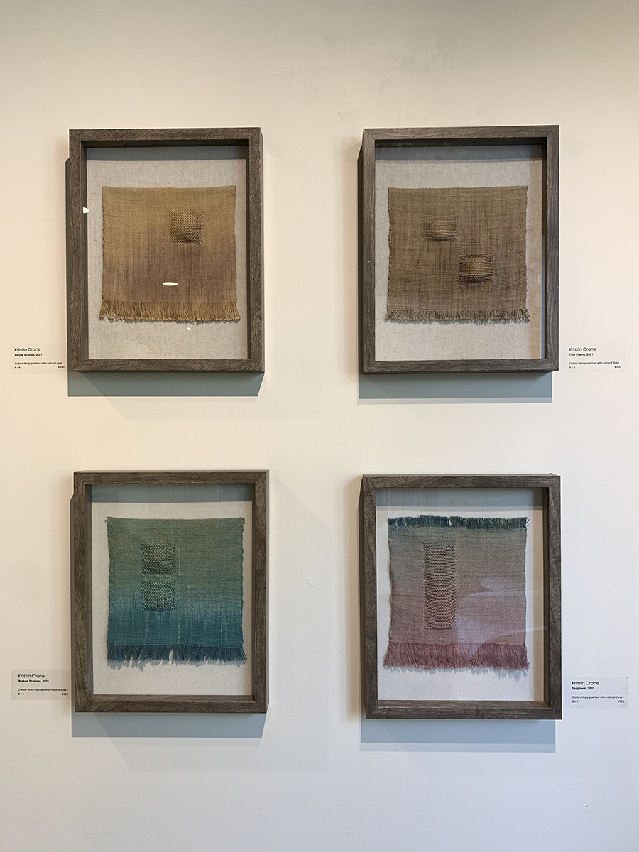 Our Director of Marketing & Communications, Kristin Crane, also has work on display. Her pieces focus on her connection to her home and environment, particularly the beach. During the pandemic lockdown, she spent time exploring the Rhode Island coast and found space and peace there. In this exhibition, she has four, small handwoven pieces made using found objects and natural dyes to create a sense of place. She also has two larger, finely woven ikat pieces dyed with indigo. Lastly, she wove and dyed a piece inspired by Kauai.