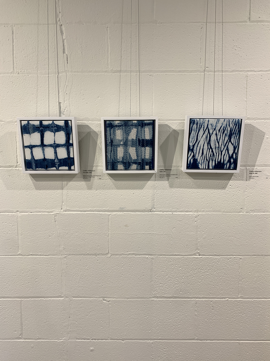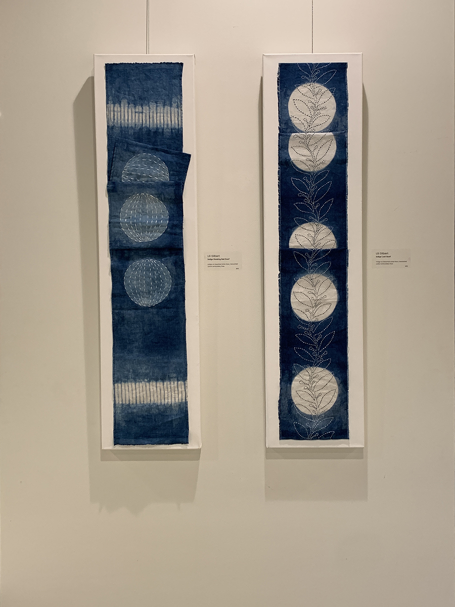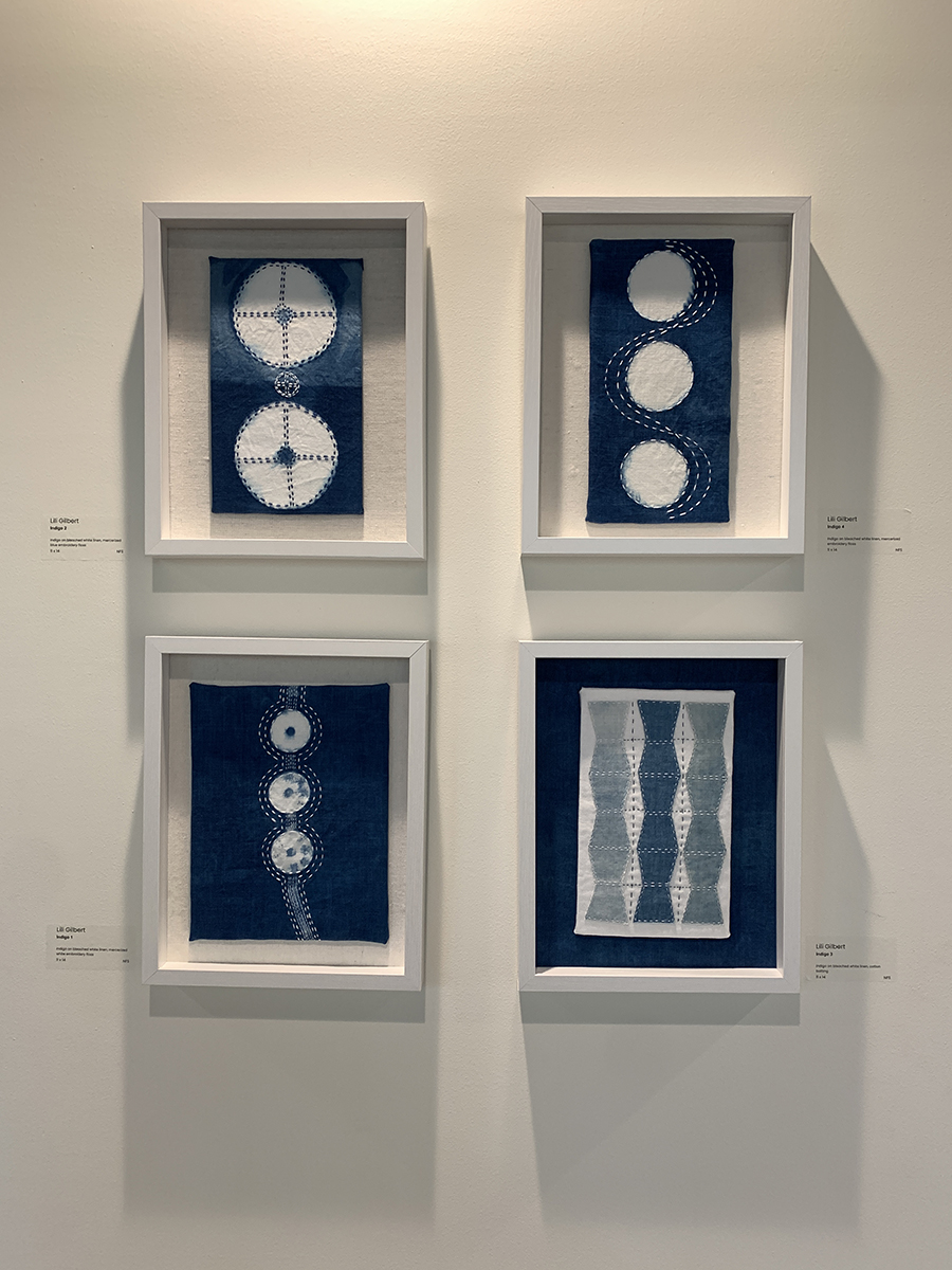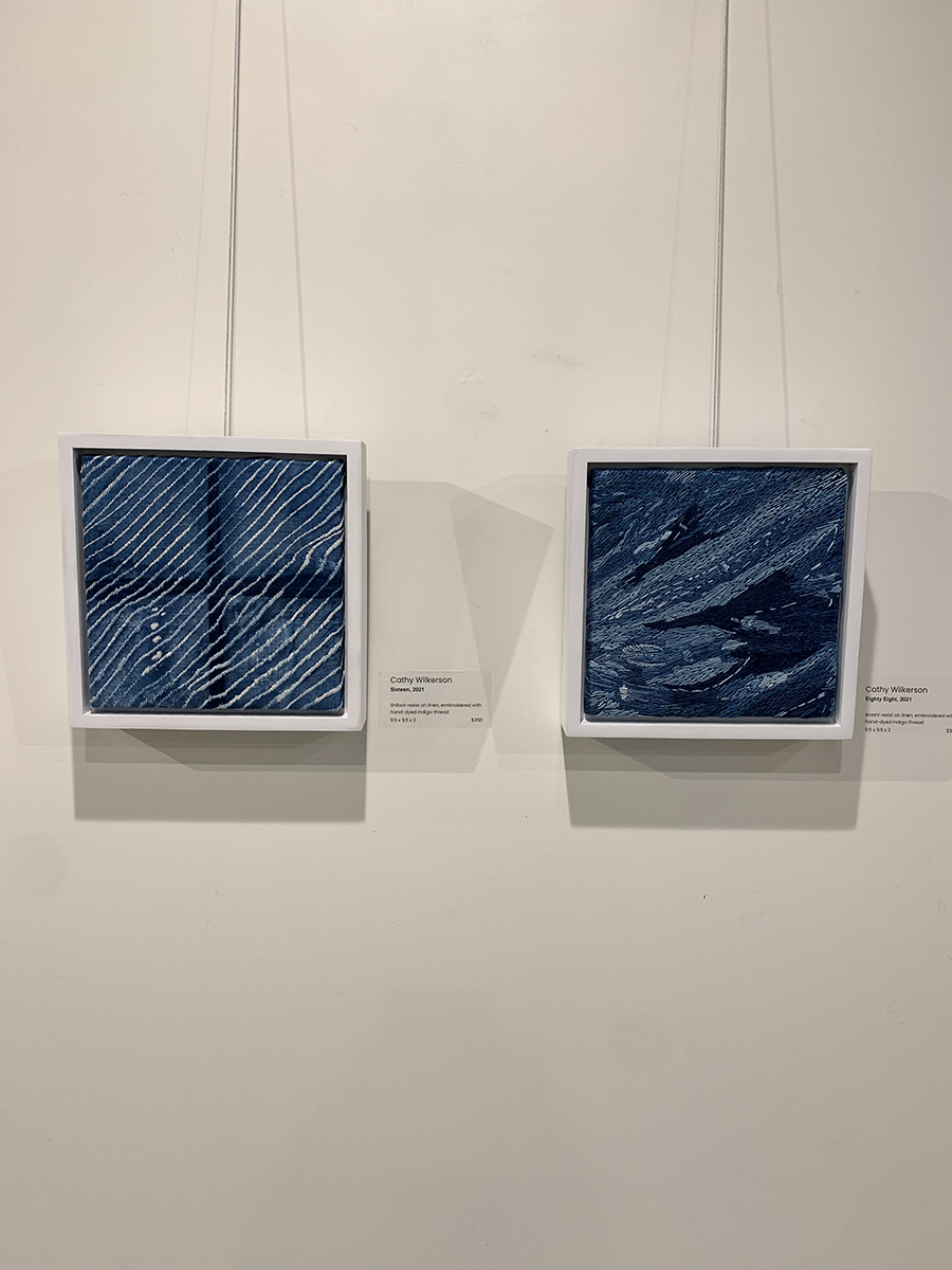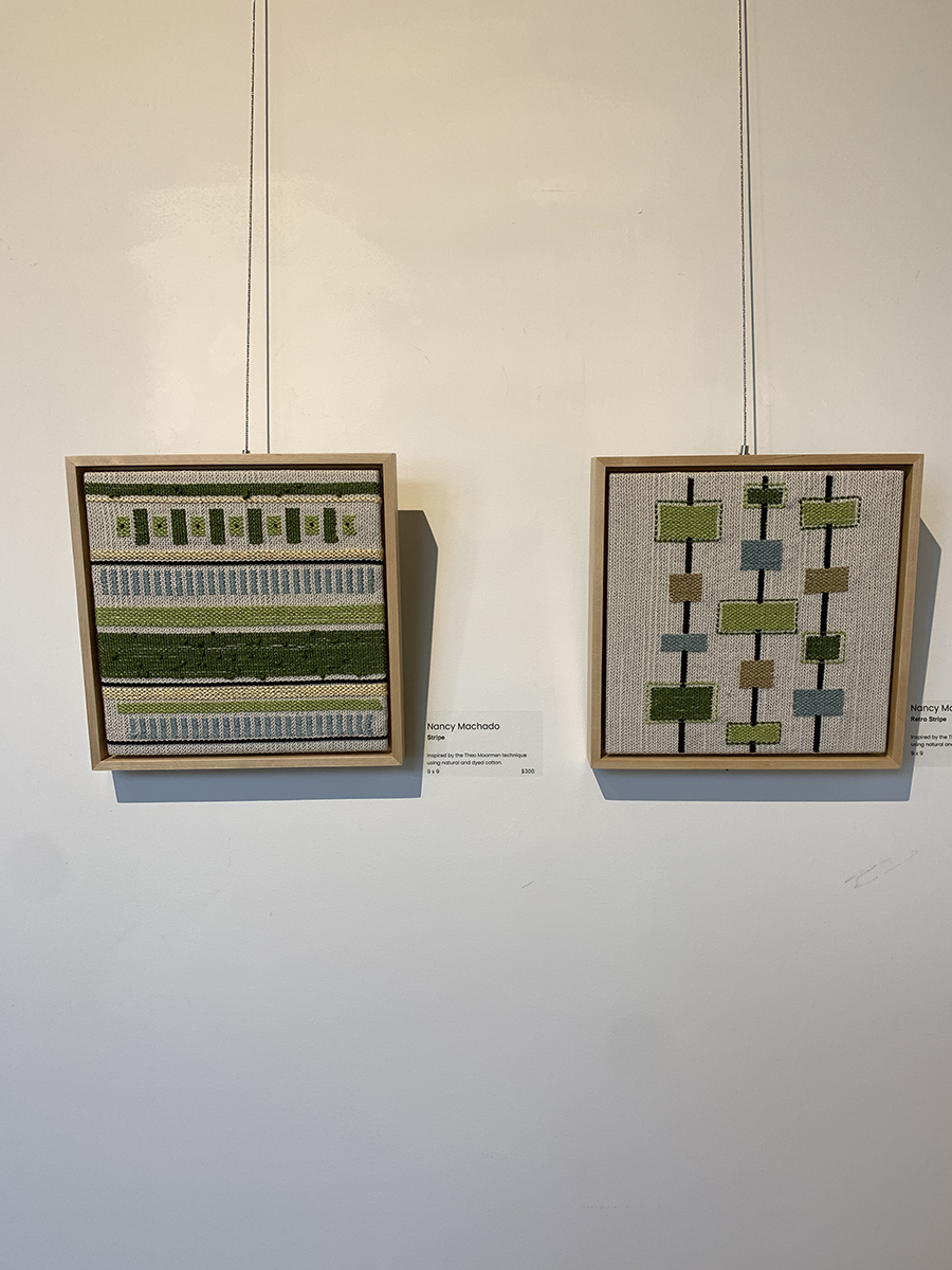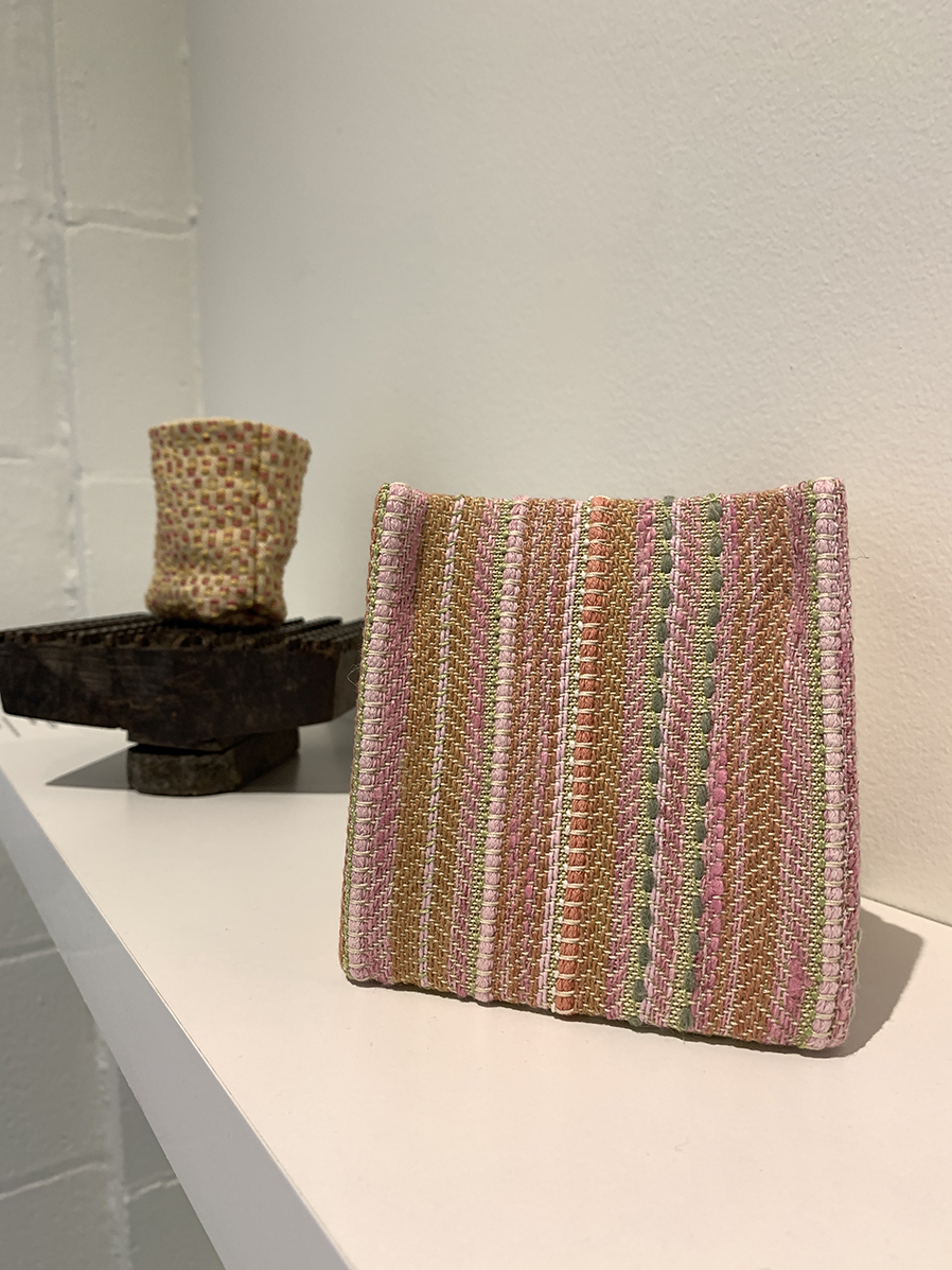 Our Director of Marketing & Communications, Kristin Crane, also has work on display. Her pieces focus on her connection to her home and environment, particularly the beach. During the pandemic lockdown, she spent time exploring the Rhode Island coast and found space and peace there. In this exhibition, she has four, small handwoven pieces made using found objects and natural dyes to create a sense of place. She also has two larger, finely woven ikat pieces dyed with indigo. Lastly, she wove and dyed a piece inspired by Kauai.