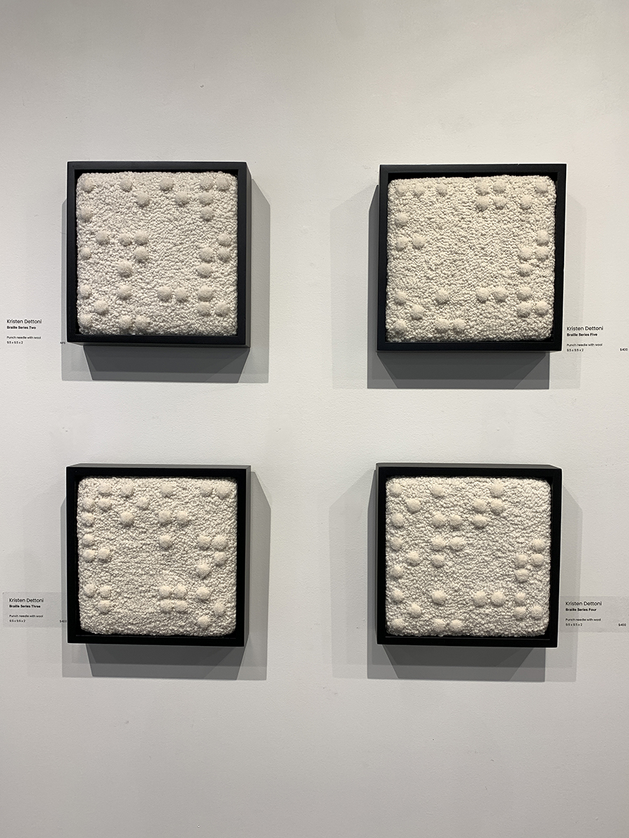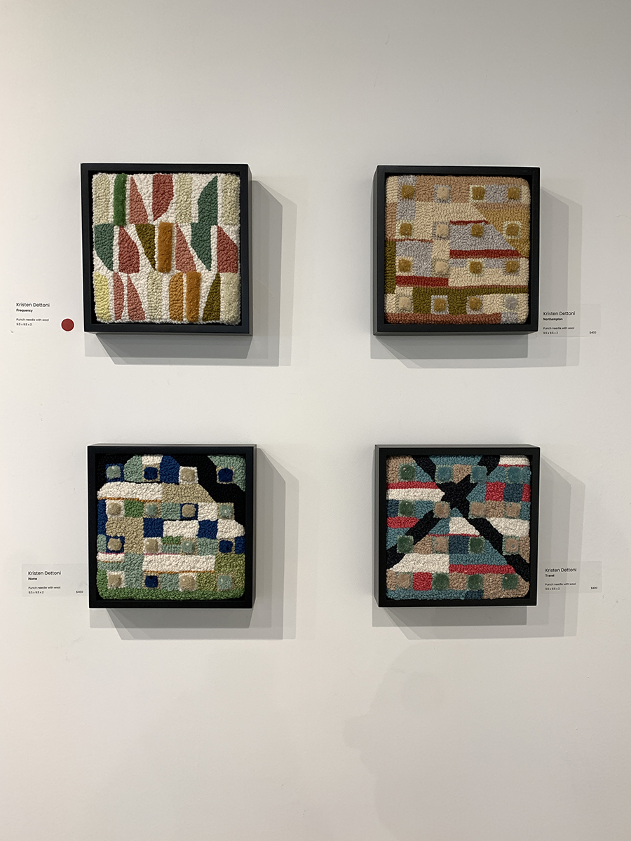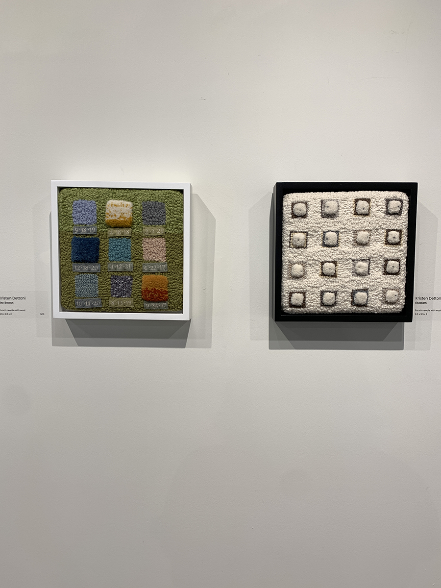 Kristen Dettoni attended the opening and presented an artist talk on the inspiration behind her Coded series. Kristen has often said that she doesn’t have a separation between her artwork and her industry work. For her, it all comes from the same well of creativity. Her original punchneedle pieces exhibited expand on the codebreaking concept she explored in The Cryptology Collection. During work at her artist residency in Snowfarm, Kristen spent time creating her own code and using it to design a series of original art pieces. It was exciting for Kristen to visit Geneva, Illinois, where Elizebeth Smith Friedman got her first job codebreaking at Riverbank, and share with the community this fun bit of local history that inspired so much of Kristen’s recent work.