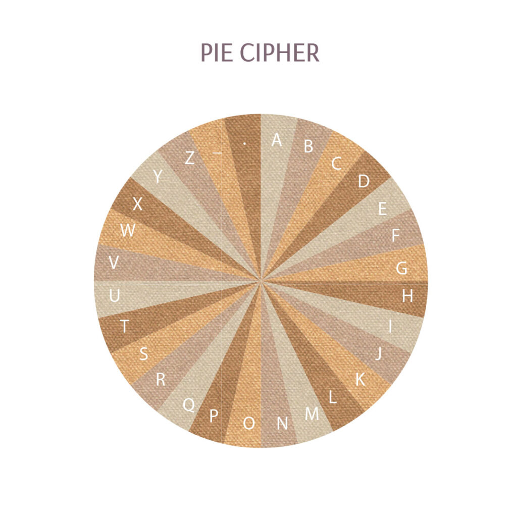 This cipher uses a circle divided like a pie chart into 26 equal parts. Then we use color and pie slice placement to identify the letters.