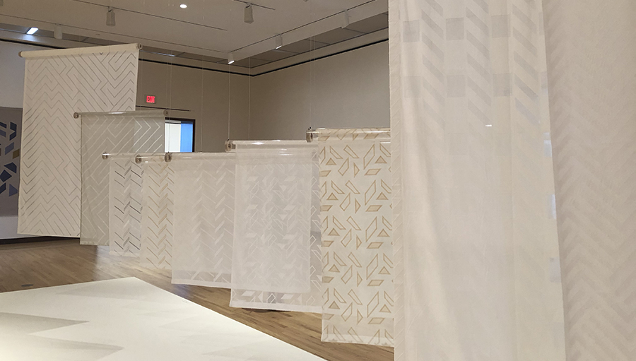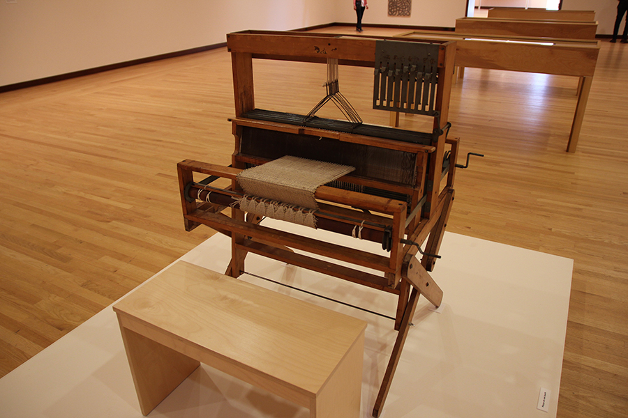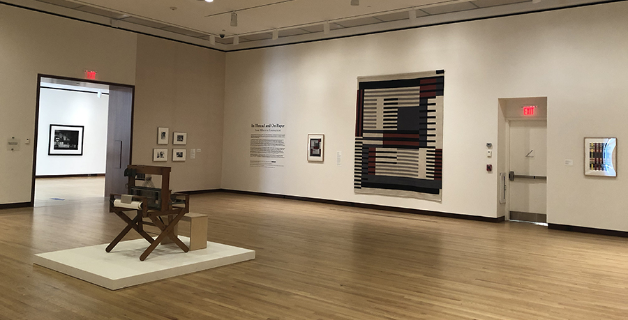 The exhibit begins at the loom, literally, with a small loom used by Albers in the center of a gallery, complete with a warp begging to be woven. From there, the exhibit explores the journey Albers’ work took. Early art pieces, which she referred to as “pictorial weavings” are beautiful examples of work she described as letting “threads be articulate again and find a form for themselves to no other end.” Alongside these art pieces are samples designed over the years for production in the industry. The exhibit continues through to her later printmaking work which she embraced later in life.
