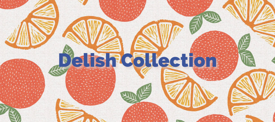 New in the library this month is the Delish Collection. This collection continues the theme of block printed fruits and vegetables first created in our Farmers Market collection.