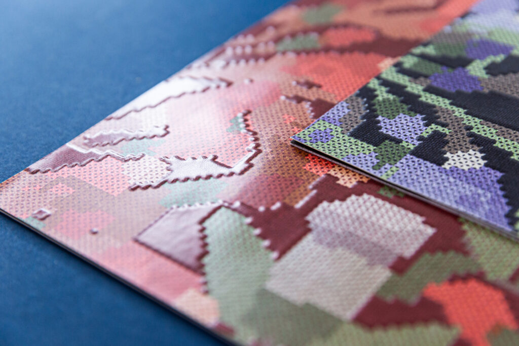 For example, in AI Sampler, Kristen uses words that look like a traditional sampler, except the words are what one would input into AI to generate a pattern design. There are also patterns with more personal symbols of where she’s lived and a calendar of her mood. All the patterns look like cross stitch, and when printed, they feel rich in dimension.